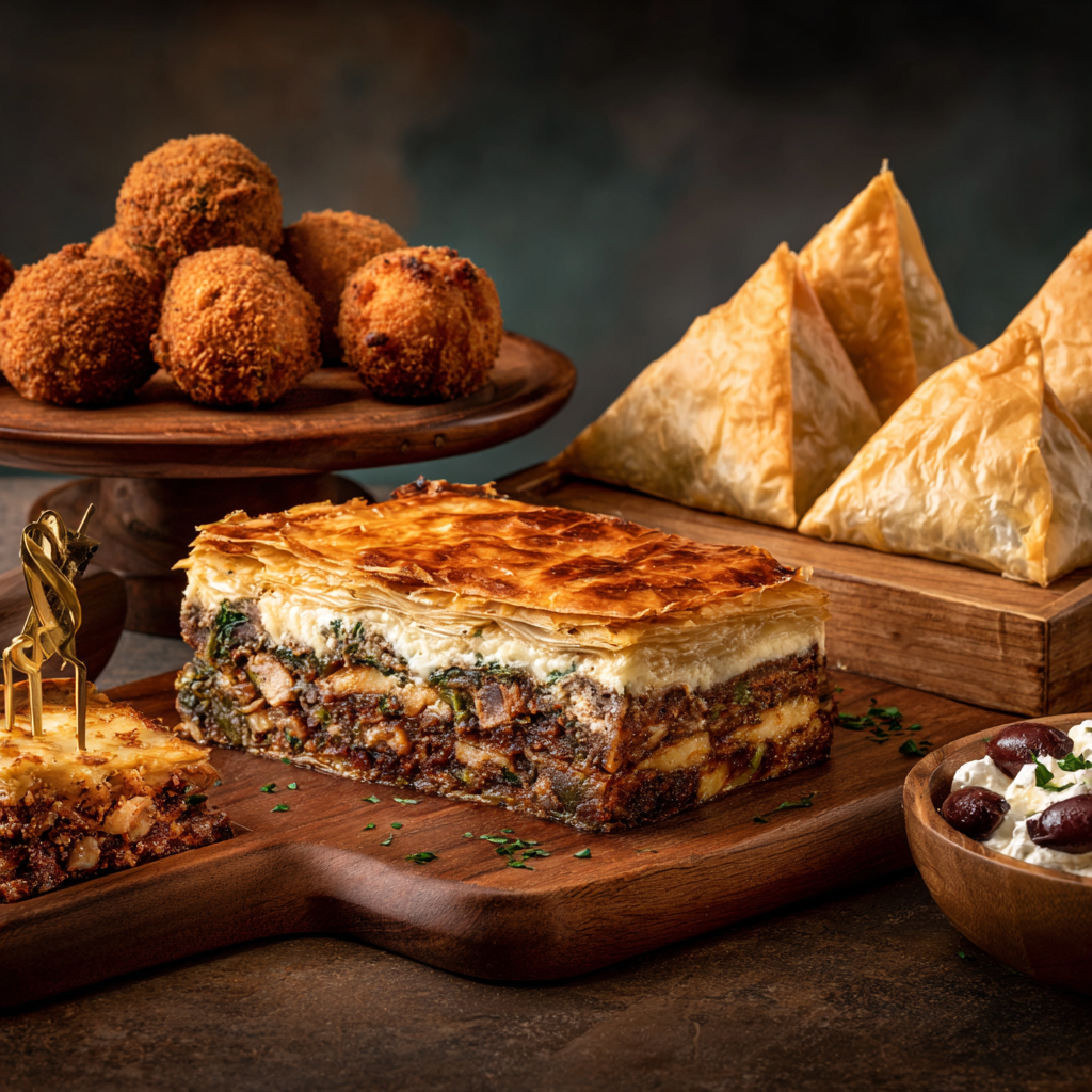Authentic Greek pies, pastries, moussaka, pastitsio, and croquettes, ready for professional kitchens.